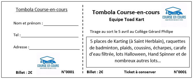 •Pour récolter plus facilement et rapidement de l’argent, nous avons décidé d’organiser une Tombola. Parmi les lots il y avait : 5 places de karting (sponsorisées par Saint Herblain), des carafes d’eau, des plaids, des jouets pour enfant (hand spinner, ballons…) Ces lots nous ont été fournis par le karting de Saint Herblain ainsi que par notre chef d’équipe (en relation avec son père).